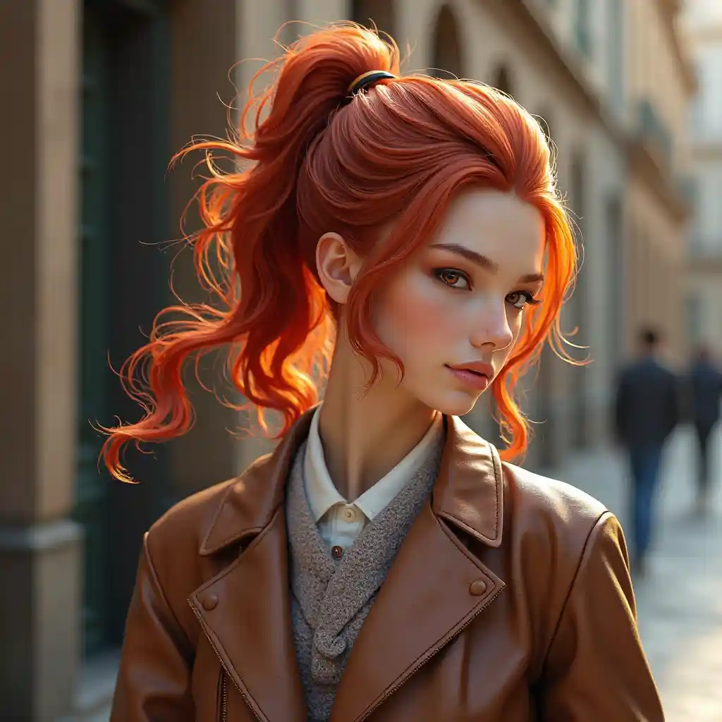 RileyRealistisches, schönes Girl-Model in Louis Vuittons 8k-Fashion-Outfit mit roten Wellenhaaren und dichtem hohen Pferdeschwanz
