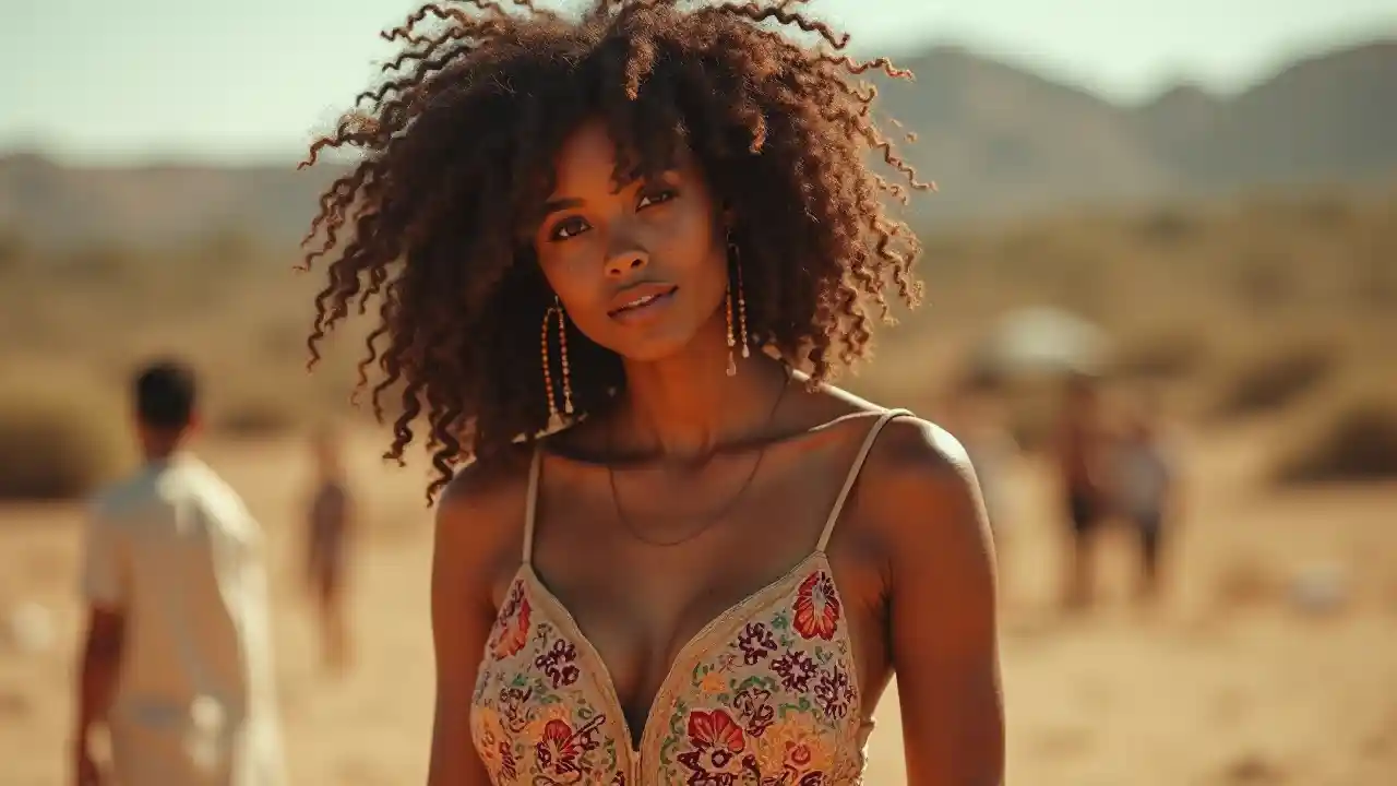 MiaSchönes afrikanisches Stickkleid mit Sommersprossen atemberaubende Mode Coachella-Foto 8k gebräunte Haut Mode Inspiration Lockengöttin Sommer Mode Fotografie