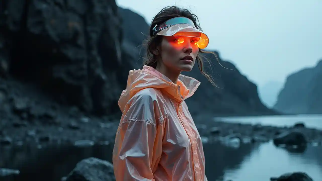an ultra high definition professional high fashion portrait of farrah fawcett studio full length photograph of a female model wearing a transparent pearlescent raincoat and neon visor in an icelandic black rock environment at dawn. no artefacts. extremely detailed. stark. refraction. shallow depth of field. volumetric light and shadow. ray tracing. light rays
