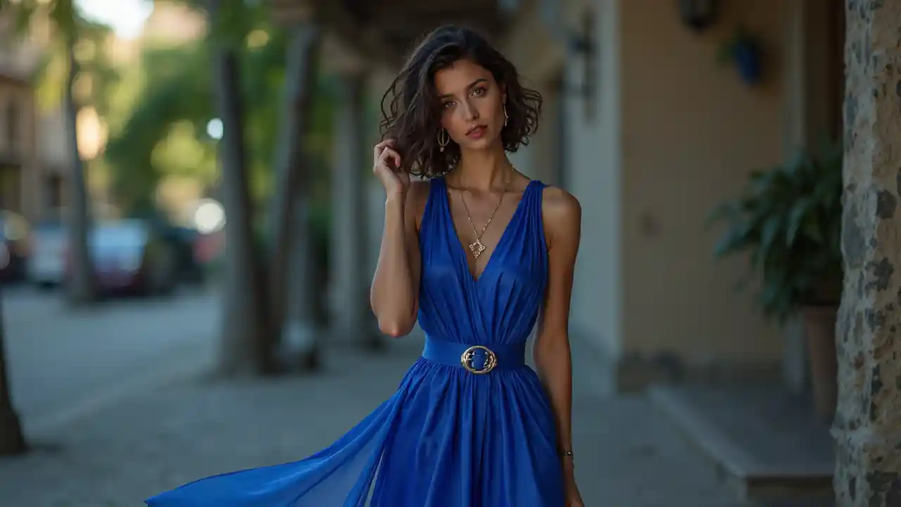 Superrealistische Mode in voller Länge, um eine extrem süße Frau mit unordentlichem schwarzem Lockenhaar zu fotografieren (((ein seidenartiger Chiffon langes ärmelloses mageres blaues Gewand. Es hat interessante Designs, die sich von der ovalen Halslinie des überlappenden Stoffes absenken. Der schmale blaue Gürtel mit einer Metallschnalle definiert die Taille, und der leichte und fließende Rock fällt vollständig auf den Boden)))), was ihr ((((erstaunliche Proportionen)) unterstreicht und ihre Aufmerksamkeit erregt ((((schöne Beine))), hängende Ohrringe, einfache Anhängerketten. Sie nimmt verführerische Posen ein. (((rote Lippen, abendliches Make-up))). Außenansicht. Berühre ihre Haare.