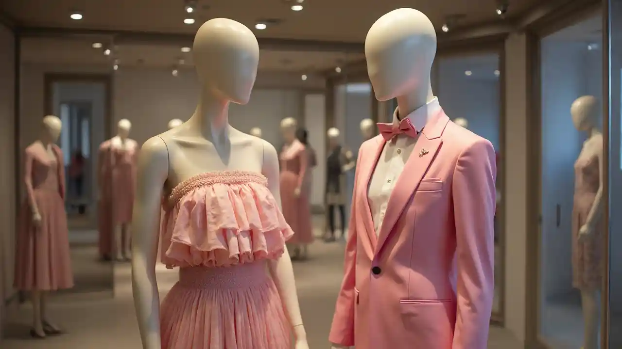 In beeindruckenden, aber realistischen Mädchen- und Jungen-Schaufensterpuppen geschichtet in Stufenkleidern und rosa Fracks