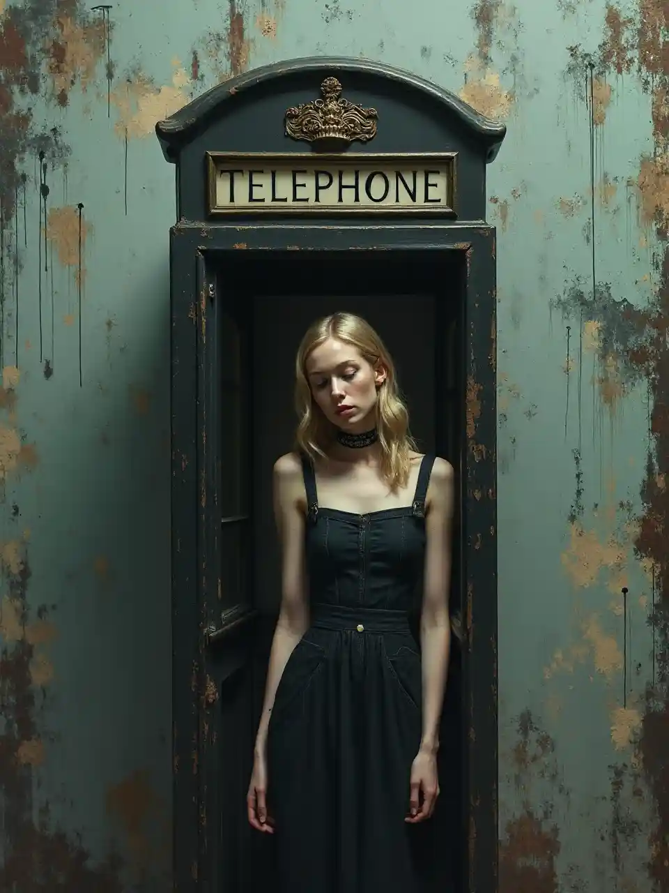 In einer überdimensionierten amerikanischen Telefonzelle aus den 50er Jahren. Der präzise formulierte Titel: "Schicksal ist Tarnung", schöner und trotzdem melancholischer Schürzelkragen-Koker Die Blondine, die Traurigkeit und Einsamkeit verkörpert, ist im Graffiti-Gothic-Grimdark-Stil entworfen und von den Künstlern Michael Creese, Todd James, Catrin Welz-Stein, Yves Klein und Edmund Dulac inspiriert, umgeben von einer eindringlichen Atmosphäre, voller dunkler, pastelliger Farben, Tiefe Emotionen, die Hoffnungslosigkeit und ewiges Dasein wecken, hyperdetaillierte, hochwertige künstlerische Meisterwerke.