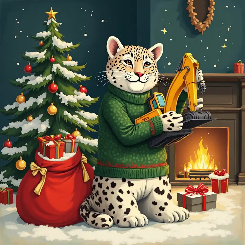 Die Retro-Illustrationswerbung im Stil der 50er Jahre zeigt das Bild eines fröhlichen Schneeleoparden in einem grünen Strickpullover, einen spielzeuggelben Kiefernraupenbagger in den Pfoten, eine riesige rote Tasche mit Geschenken und einen großen Weihnachtsbaum dahinter, ein Feuer brennt im Kamin, fabelhafte Silvester und fröhliche Atmosphäre, Farben - Rot, Weiß, Gelb, Grün, Dunkelblau, Heidelkabel