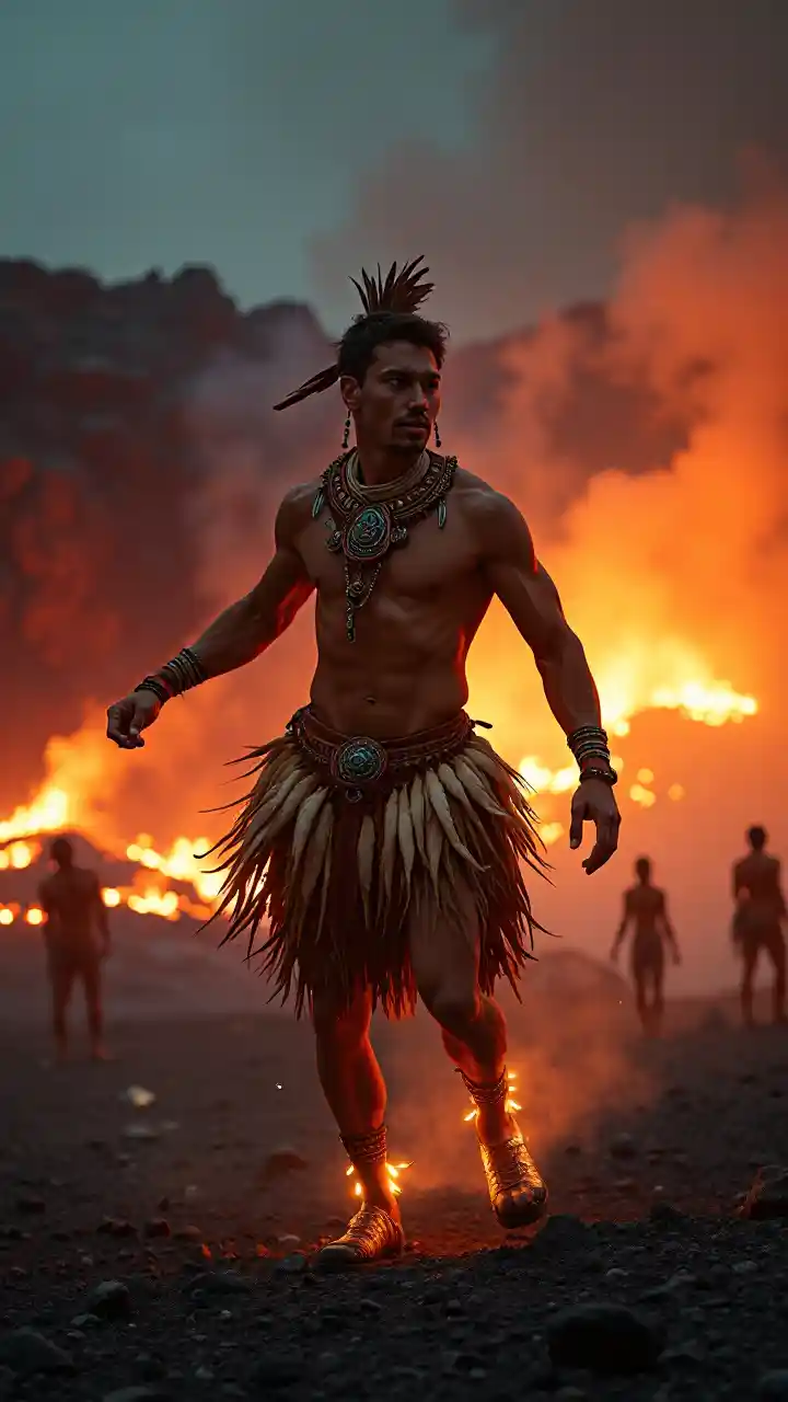 Bei einem Kriegstanz in der Vulkanarena glänzt ein weißer Mann Mitte 20 in einem gefiederten Pferdegeschirr. Die Lava fließt, der Sternenhimmel umrahmt ihn, seine rhythmischen Bewegungen und seine jugendliche Energie strahlen in einer feurigen, weltfremden Umgebung originellen Stolz und dynamischen Reiz aus.