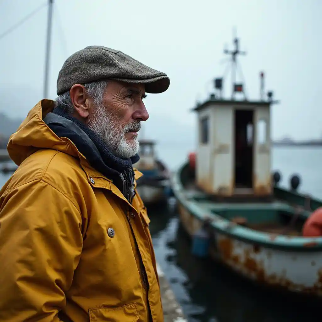 Ein rauer Fischer Mitte 50 blickt mit festem Blick aufs Meer. Er trägt eine Wollmütze und einen gelben wasserdichten Mantel. Hinter ihm liegen mehrere Fischerboote mit abgebrochenem Lack und Verwitterung an der Anlegestelle. Im National Geographic Style