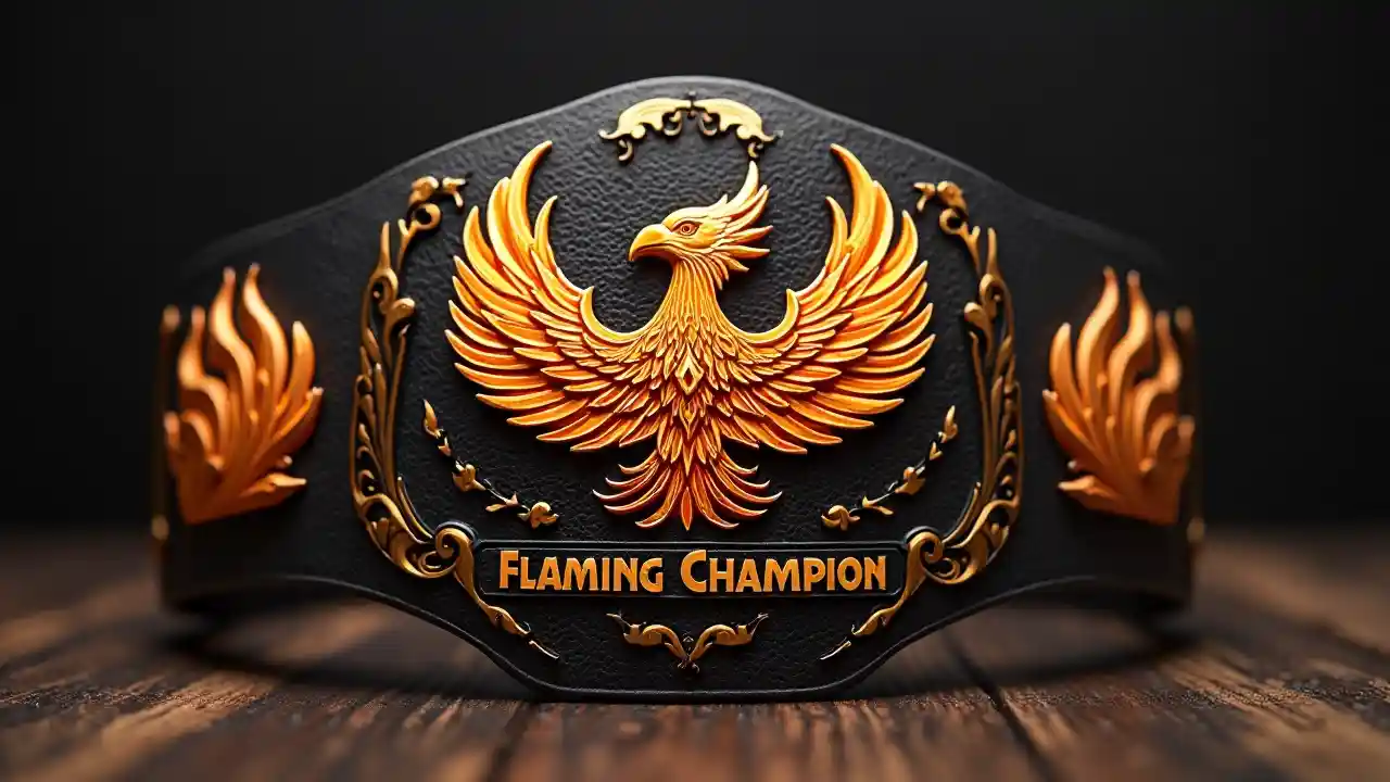 Ein schwarz-goldener Wrestling-Gürtel mit einem feurigen orangefarbenen Phönix mit der Aufschrift Feuerrot Champion.