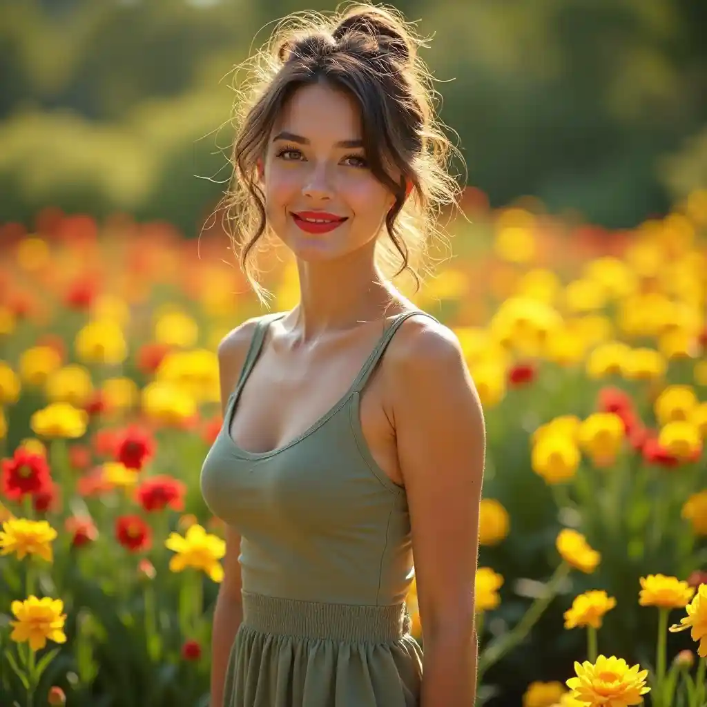 Hochwertiges Bild, ein hübsches 22-jähriges Mädchen mit dunklen Haaren, leicht gebräunt, unordentlicher Dutt, roter Lippenstift, mittlerer Oberweite, Sportskleid, im schönen gelb-roten Blumengarten, Sonnenlicht