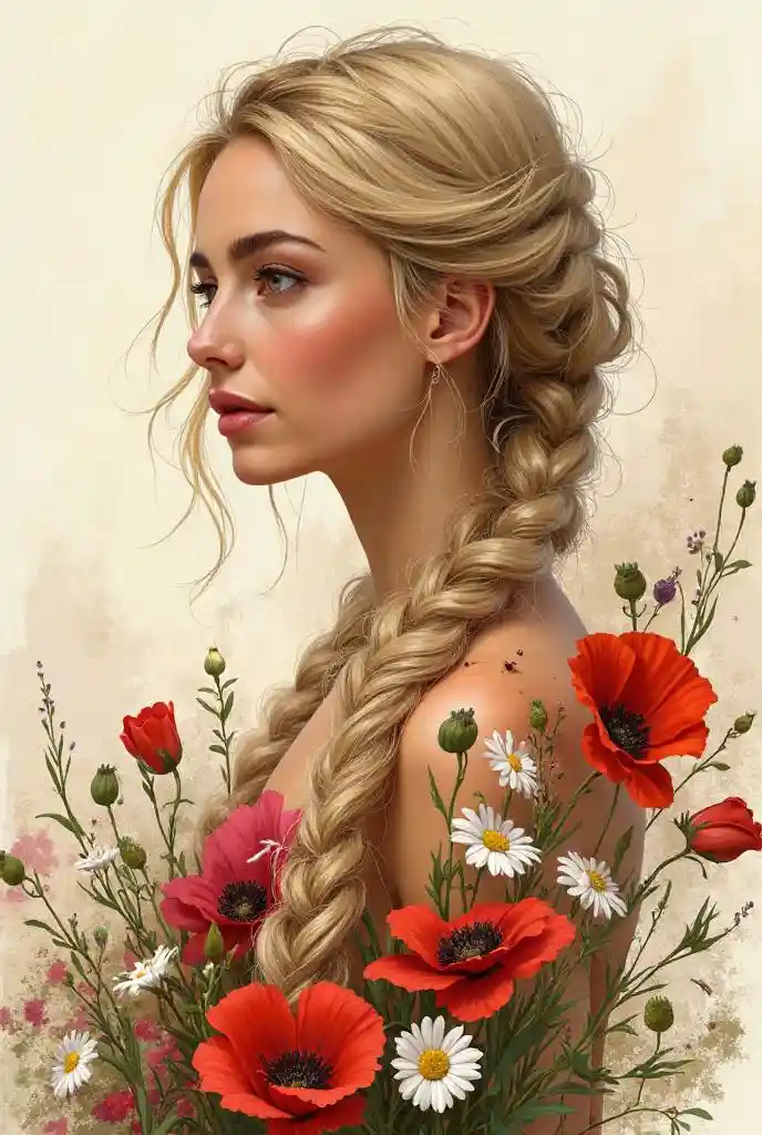 Frauenskizzen, digitale Malerei, israelische Schönheiten, Fantasie, schöne Frauen mit eleganten goldenen langen Zöpfen, geflochtenen Bändern, wilden Blumensträußen Mohnblumen und Gänseblümchen