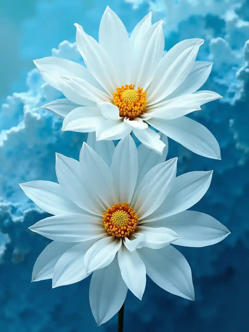 IsabellaAbstraktes digitales Foto des Themas: Nahaufnahme riesiger weißer Blüten auf blauem Grund, ähnlich wie Wellen in Wellen Realismus. S-gamma.Meisterwerk. 688х1536,
