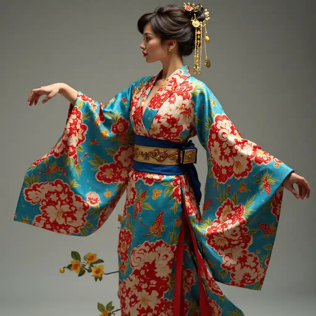 OwenFrau im bunten, komplizierten, blumigen Kimono Ganzkörper-Pose, Edelstein-Töne, leuchtende Farben, Action-Pose, Details an Ärmeln und Röcken, Charm-Pose, surrealistischer Stil:: Superdetail, 8k, exquisite Details