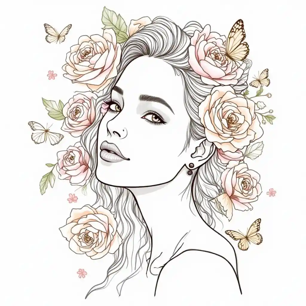 Exquisite künstlerische Linienkunst-Illustrationen, die das Gesicht einer jungen Frau mit Blumenelementen, Schmetterlingen und Details zum Thema Schönheit kombinieren. Das Frauengesicht soll weich, elegant, friedlich sein und nahtlos in blühende Blüten wie Rosen oder Pfingstrosen übergehen. Schmetterlinge sollten sanft um Gesicht und Blumen erscheinen und die Schönheit und Leichtigkeit des Kunstwerks verstärken. Beinhaltet subtile Elemente, die Schönheit repräsentieren, wie abstrakte Formen von Make-up-Werkzeugen (wie Pinsel oder Spiegel), aber halten Sie sie auf ein Minimum und eine Verfeinerung. Der Gesamtstil soll komplexe, saubere, elegante Linienkunst mit moderner, anmutiger Note sein. Die Farbabstimmung sollte schlicht sein, hauptsächlich schwarz und weiß, mit subtilen Akzenten wie Pink oder hellem Gold in weichen Pastelltönen, um Schönheit und Harmonie zu betonen. "