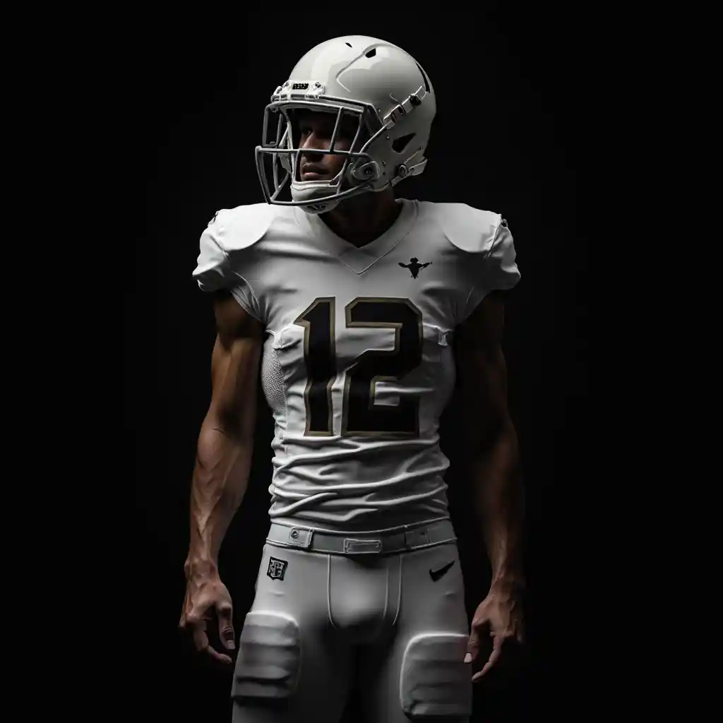 American football player, unbranded white uniform, no number, black background, dark atmosphere