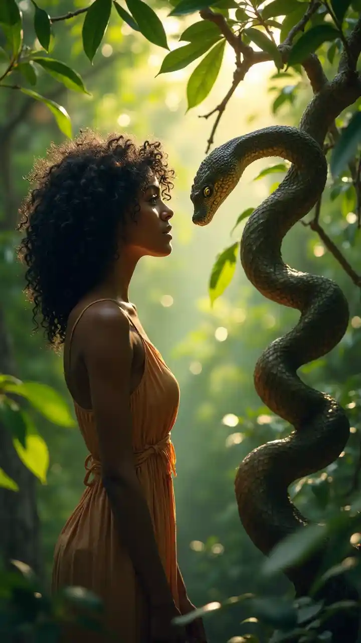 @ 7EWZ2zxGPJSNDQDCNFOU, dichtes schwarzes Lockenhaar unten, steht auf einer üppigen, sonnigen Waldlichtung. Ihre dunkelbraune Haut leuchtet warm im gefilterten, sanften Sonnenlicht. Sie starrte aufmerksam auf @ 3w3ylZZwucleKckMcCMO, eine Schlange, die um einen tief hängenden Ast gewickelt war. @ 3w3ylZZwucleKckMcCMO ist startklar und flüstert verführerisch zu@7EWZ2zxGPJsndqDcnFOU. In der Hand hält sie eine lebendige verbotene Frucht, deren Oberfläche vor Versuchung schimmert. Der Wald umgibt sie, ein Wandteppich aus sattem Grün und melierten Schatten, der eine intime, fast heilige Atmosphäre schafft. Die Kamera fängt die Szene aus einem leicht erhöhten Winkel ein und unterstreicht die Spannung und Versuchung zwischen@7EWZ2zxGPJsndqDcnFOU und @ 3w3YLZZwucleKckMcCMO. Das Sonnenlicht filtert durch die Blätter und projiziert komplizierte Muster über die gesamte Szene und unterstreicht den Moment der Entscheidung. @ 7EWZ2zxGPJsndqDCNFOU gab nach, verbotene Früchte zu essen.