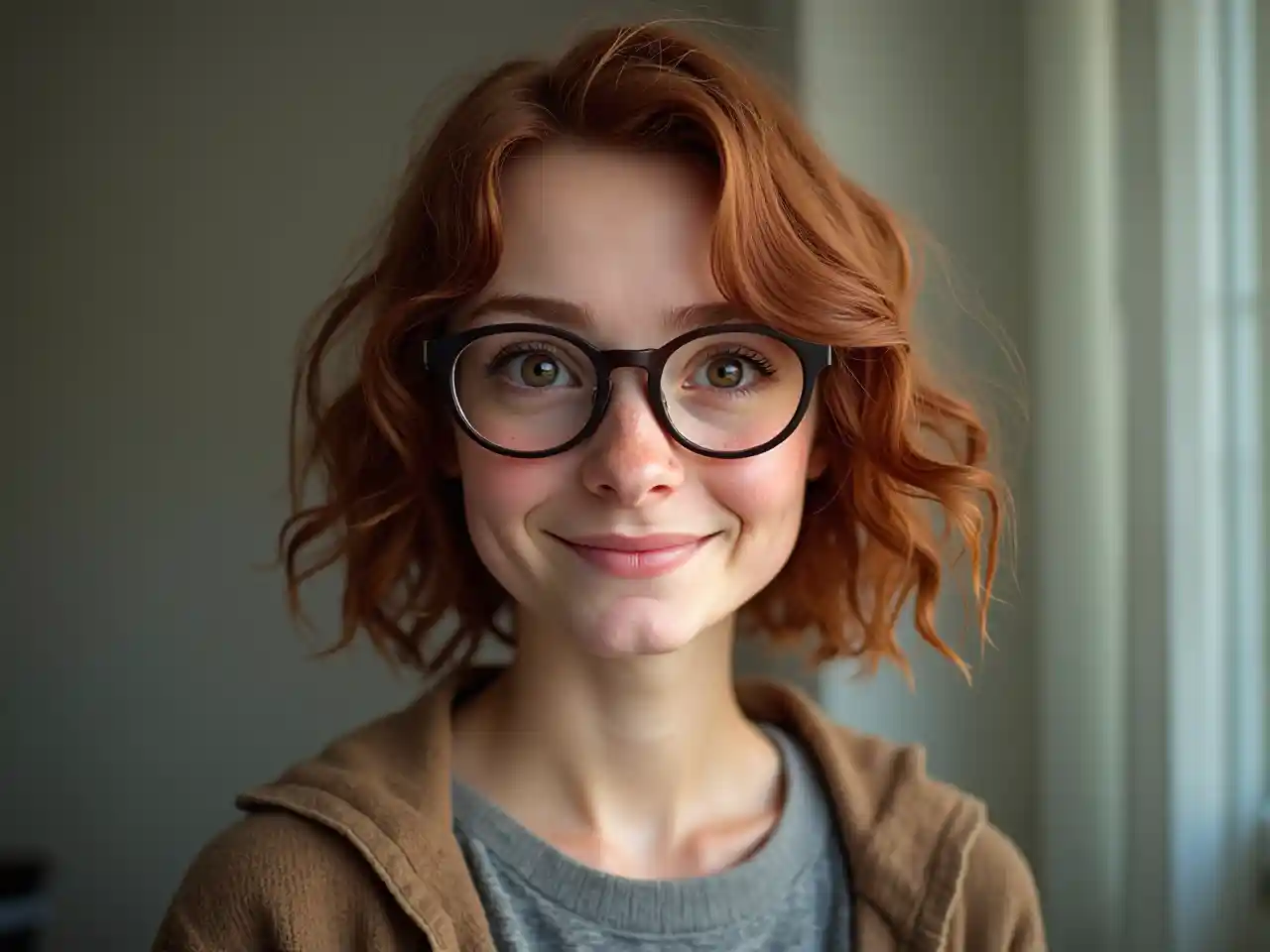 Junges Mädchen Ca. 21 Jahre alt Rot-braune Haare Kürzeres, welliges Haar Braune Augen Mädchen-Style von nebenan Lächeln Freundlicher Blick Ruhig Zurückhaltende Schönheit Nerd Brille