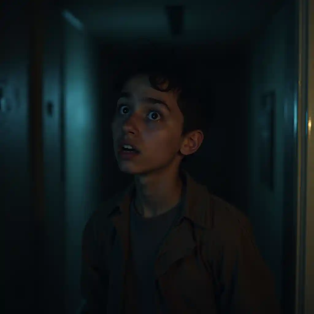 GraysonDer verängstigte junge Mann im dämmerlichen Licht schaut sich ängstlich um, filmt, super realistisch, super hochauflösend, flache Schärfentiefe, spannende Atmosphäre, nachts drinnen