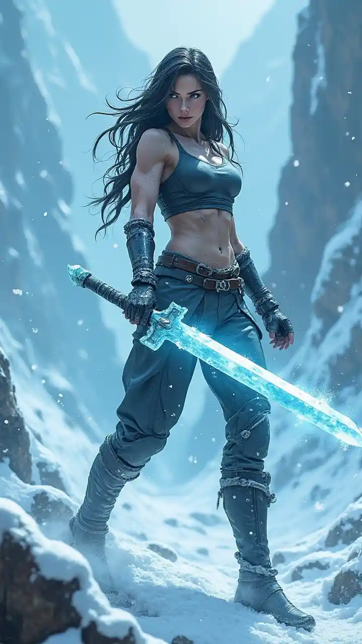 @ lbK8EQWU1r8WEQH2g1L6 Eine muskulöse Kriegerin schwingt ein Schwert aus glitzernden Eiswürfeln und steht in einer dynamischen Kampfhaltung. Ihr Standort ist eine zerklüftete, eisige Landschaft mit gezackten Gletschern und schneebedeckten Felsen. Ihr angespannter Blick ist nach vorne gerichtet, ihr Körper ist leicht verzerrt, als wäre sie bereit zum Angriff. Ihre Rüstung ist geschmeidig und funktional, im kalten Licht glitzern eisgefrorene Akzente. Das helle, eisige Licht des eiskalten Schwertes wirft ein blaues Licht auf ihre Haut und ihre Umgebung. Schneeflocken kreisten um sie, ein leichter Nebel steigt aus dem eisigen Boden auf und unterstreicht die kalte Umgebung. Diese Szene wurde aus einem etwas tieferen Winkel aufgenommen und unterstreicht ihre kraftvolle Haltung und die scharfen Kanten ihrer eiskalten Waffe.Das dramatische Licht verstärkt Spannung und Bewegung.