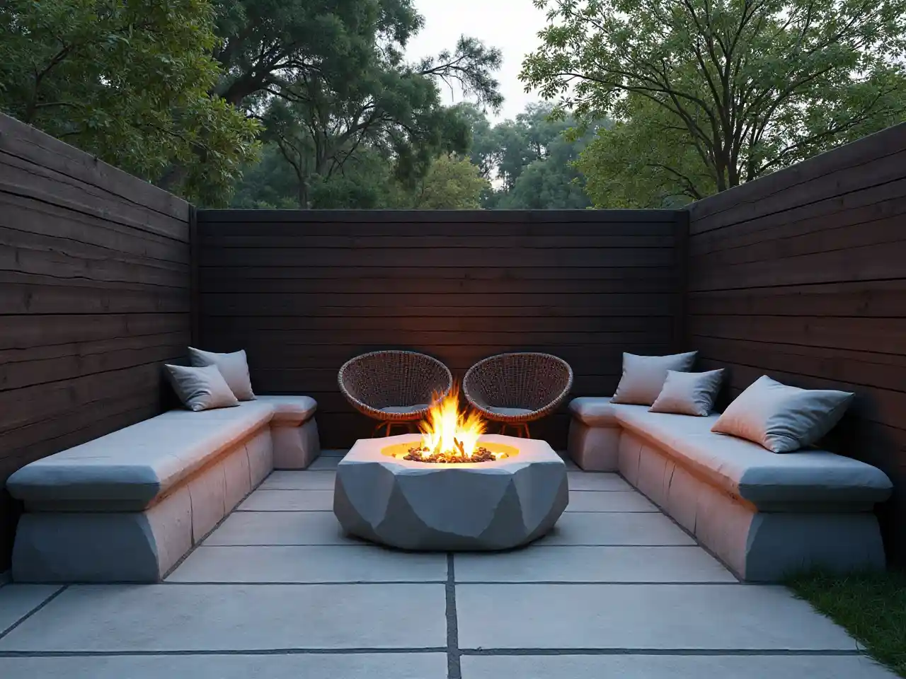 Gaudi-Style. Eine Spielfläche mit Feuerstellen in einer Ecke des Zauns. In einer Ecke des Zauns befinden sich zwei Wände, die in einem 90-Grad-Winkel aufeinander treffen. Der gesamte Zaun besteht aus waagerechten, dunklen Brettern mit kleinen Lücken zwischen den Brettern. Direkt neben dem Zaun auf beiden Seiten befinden sich Sitzbänke, deren polygonale Unterlage aus grauem Beton besteht. Auf den Bänken stehen Kissen. Der Feuerloch im rechteckigen Flächenzentrum hat den gleichen Polygonalstil wie der Banksockel. Gegenüber dem Zaun, nahe der Feuerstelle, befinden sich zwei Gartenstühle aus dunklen Rattanen (mit dem Rücken zum Betrachter). Diese Fläche ist quadratisch und schön gefliest. Fotos – realistische Bilder. Abends, gemütlich, hinter dem Zaun liegt der Park.