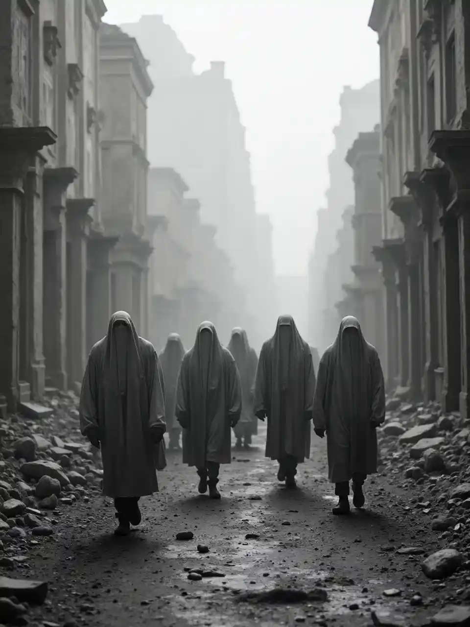 Bilder von Graustufen eines Geisterspielmannszugs, der durch eine zerstörte Stadt wandelt.