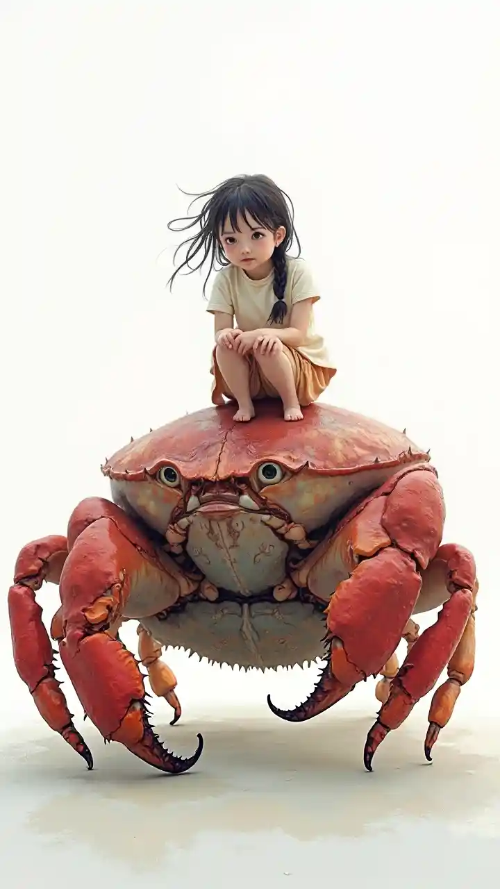 Riesenkrabbe, das Mädchen sitzt oben, weißer Trauer im Hintergrund,