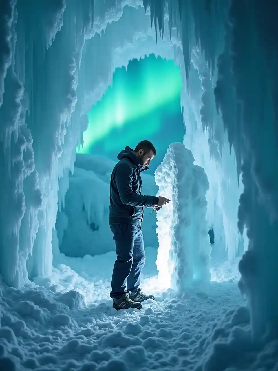 Eiswürfel in Gletscherhöhlen geschnitzt, glänzt ein weißer Mittvierziger in einem warmen Parka. Glitzernde Tropfsteine und Polarlichter umrahmten ihn, und seine geschickten Meißelarbeiten und sein starker Fokus strahlten künstlerisches Genie und ursprüngliche Kraft in einer eisigen, ätherischen Umgebung aus.