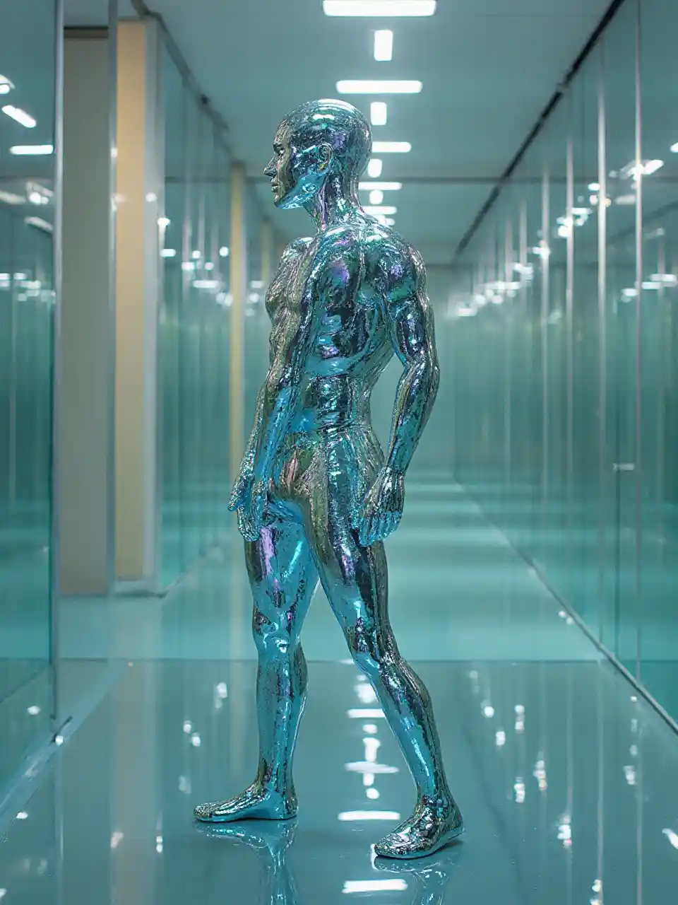 ColtenZeichnen Sie einen Mann aus Glas, im Hintergrund eines Spiegels, mit Regenbogenfarben und hyperrealistischem Minimalismus