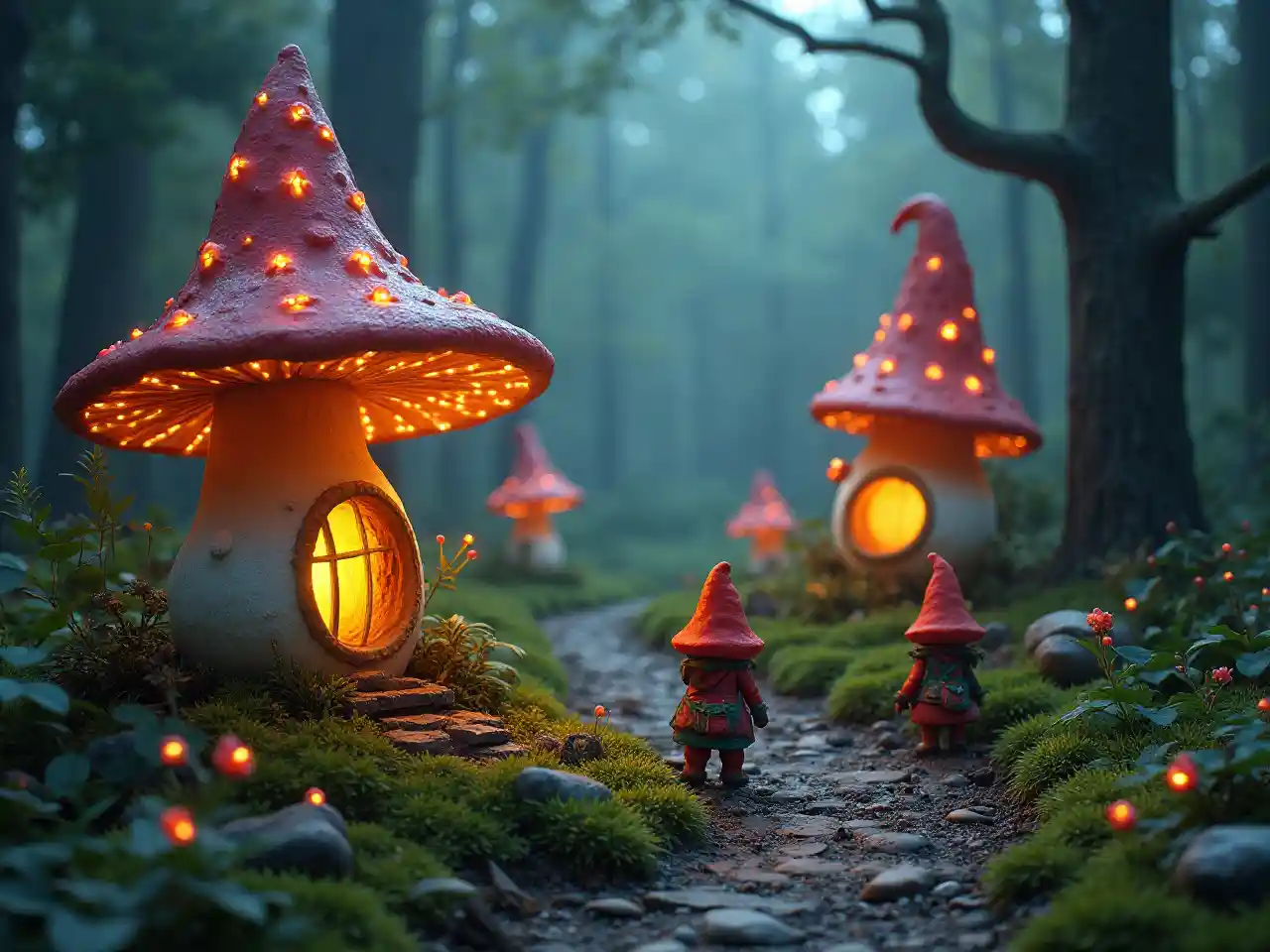 Zwei Zwerge auf einem Weg zum leuchtenden Pilzhaus im Wunderwald