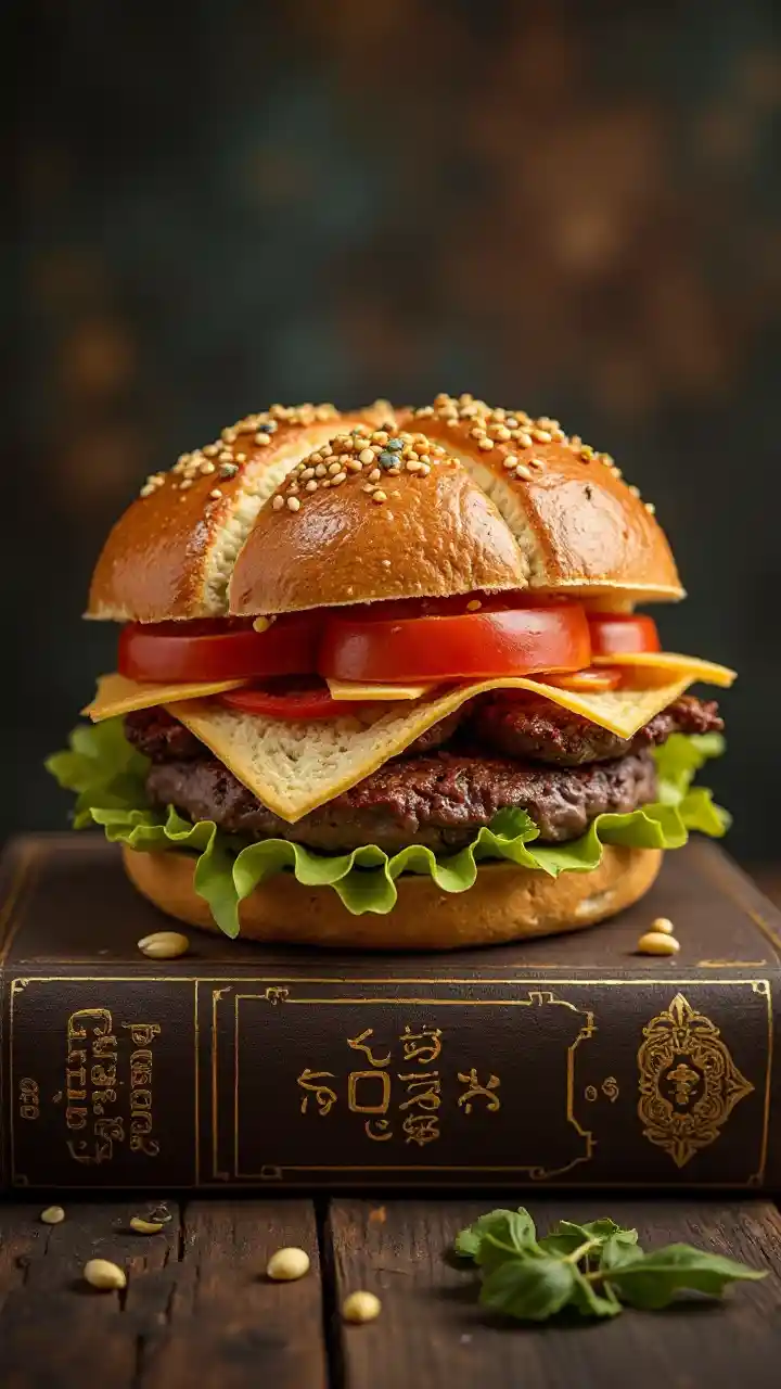 Es gibt atemberaubende Interpretationen der ultimativen Sandwiches der Bücher, goldene Brötchen mit Samen, Salat, Tomatenscheiben, Hardcover-Bücher mit goldenen Gravuren, hochdetailliert und komplex, goldener Schnitt, super extrem, wunderschön, luxuriös