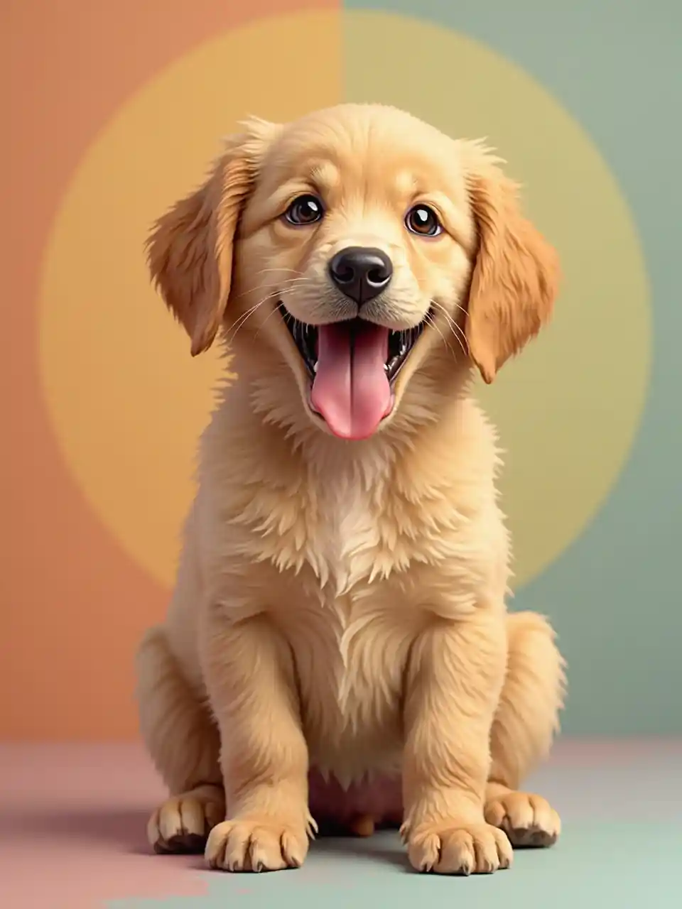 Ein sehr fröhlicher Golden Retriever Welpe auf buntem Hintergrund
