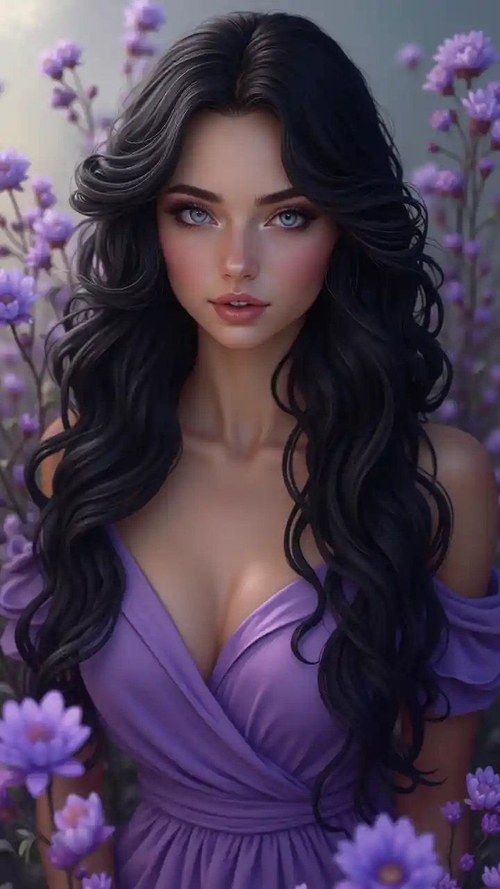 Stellen Sie sich eine (((glamouröse Frau)) vor, die ätherisches Wesen ausstrahlt, mit (((sehr langes wellenförmiges schwarzes Haar, das ihr Gesicht umreißt))), die sich in (weiches, fließendes lockiges Haar) nach unten schüttet. Ihre Augen sind (schöne Blautöne), haben (blasse Haut) (natürliches Licht). Ihre Lippen sind voll und lackiert (weiche, natürliche Töne). Sie trägt ein (lila Kleid), das ihre (perfekte Figur) betont, (lila Blüten) beleuchtet sanft ihre Gesichtszüge. Dieser Hintergrund ist in (weiches, leuchtendes Licht) getaucht und schafft eine (verträumte Atmosphäre), die zu ihrer natürlichen Schönheit passt.