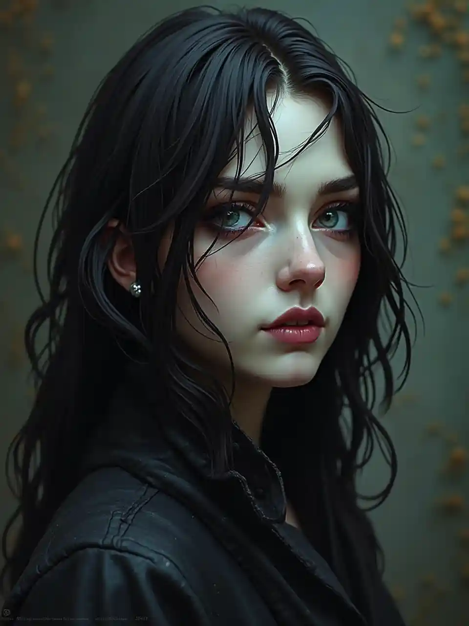 ElijahSchöne blasse Haut, dunkelbraunes Haar, stilisierte Haare, blaue Augen, Frau schaut leicht nach oben in die Ferne, 3/4, Goth, Böse