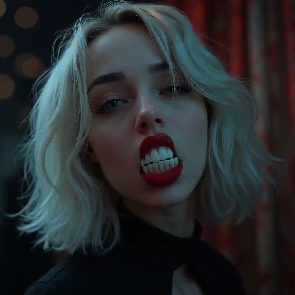 Das realistische Bild des Vampirs mit halbgeschlossenen Augen und zurückgelegtem Kopf, der fast betrunken aussieht, ihr Mund öffnet sich leicht mit rotem Lippenstift, so dass wir ihre Vampirzähne, silberne Haare, mittlere Haare, Gotik, Kybernetische Prothese, Cluboom, Goth, Objektivblende, launische Beleuchtung, Hintergrundbeleuchtung, Volumenbeleuchtung, Ultra-Detail, 8k-Auflösung,