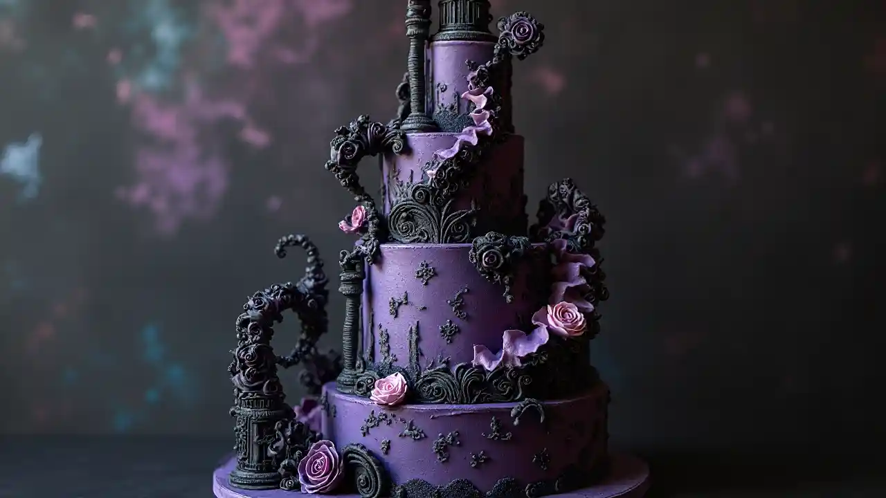Dies ist eine skurrile Hochzeitstorte, inspiriert vom dunklen und bezaubernden Stil von Tim Bolton, mit eleganten und verzerrten Ebenen und komplizierten gotischen Details. Die Torte ist mit exzentrischen, asymmetrischen Verzierungen geschmückt, vom Spiralturm bis hin zu schaurigen, zarten Spitzenmustern. Die Farbpalette umfasst dunkles Violett, Schattenschwarz und ein vages Geisterweiß und schafft eine faszinierende und leicht surreale Atmosphäre. Spielerisch, aber mysteriös, greift dieser Kuchen die Essenz von Tim Boltons einzigartiger Welt auf, mit fantastischen und fantastischen Elementen.