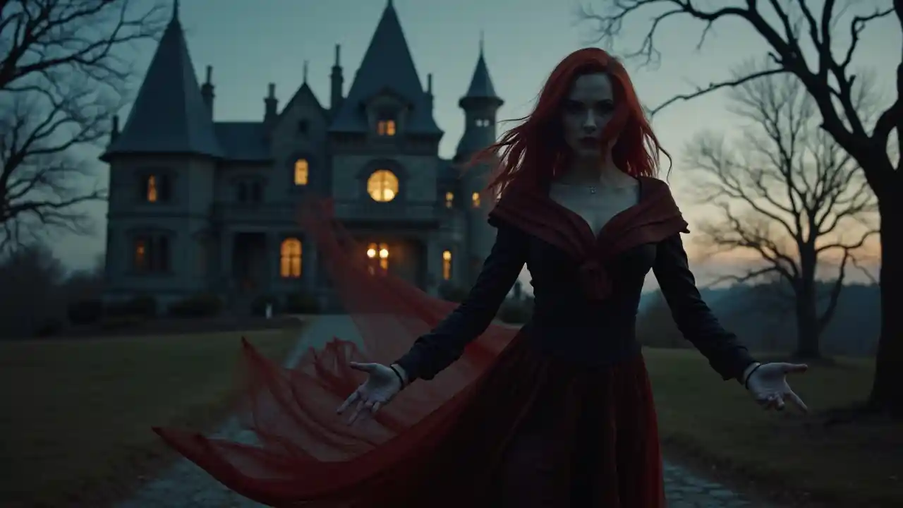 Produziert von Universal Pictures, erschreckende Halloween Dämmerung mit Emma Stone als heimtückische, blutüberströmte Vampirgräfin, düstere und unheimliche gotische Burgen, surreale Ängste, Halloween-Glamour, Filmfotografie, Action-Shooting, Action, Epos, HD