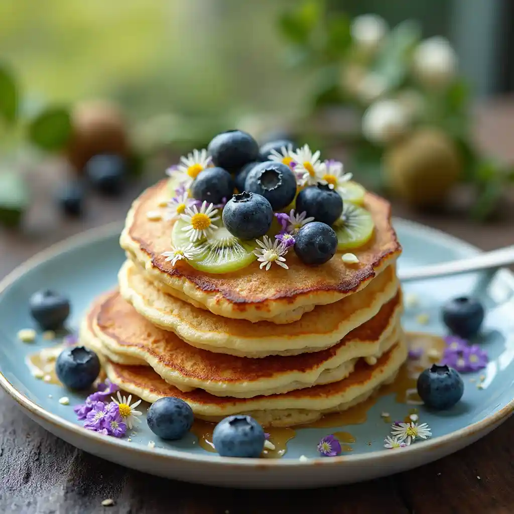 LeilaHeidelbeer-Kiwi-Pfannkuchen mit Kamillenblüten verziert, helle Atmosphäre, Provence, Tiefenschärfe, unglaublich hohe Details