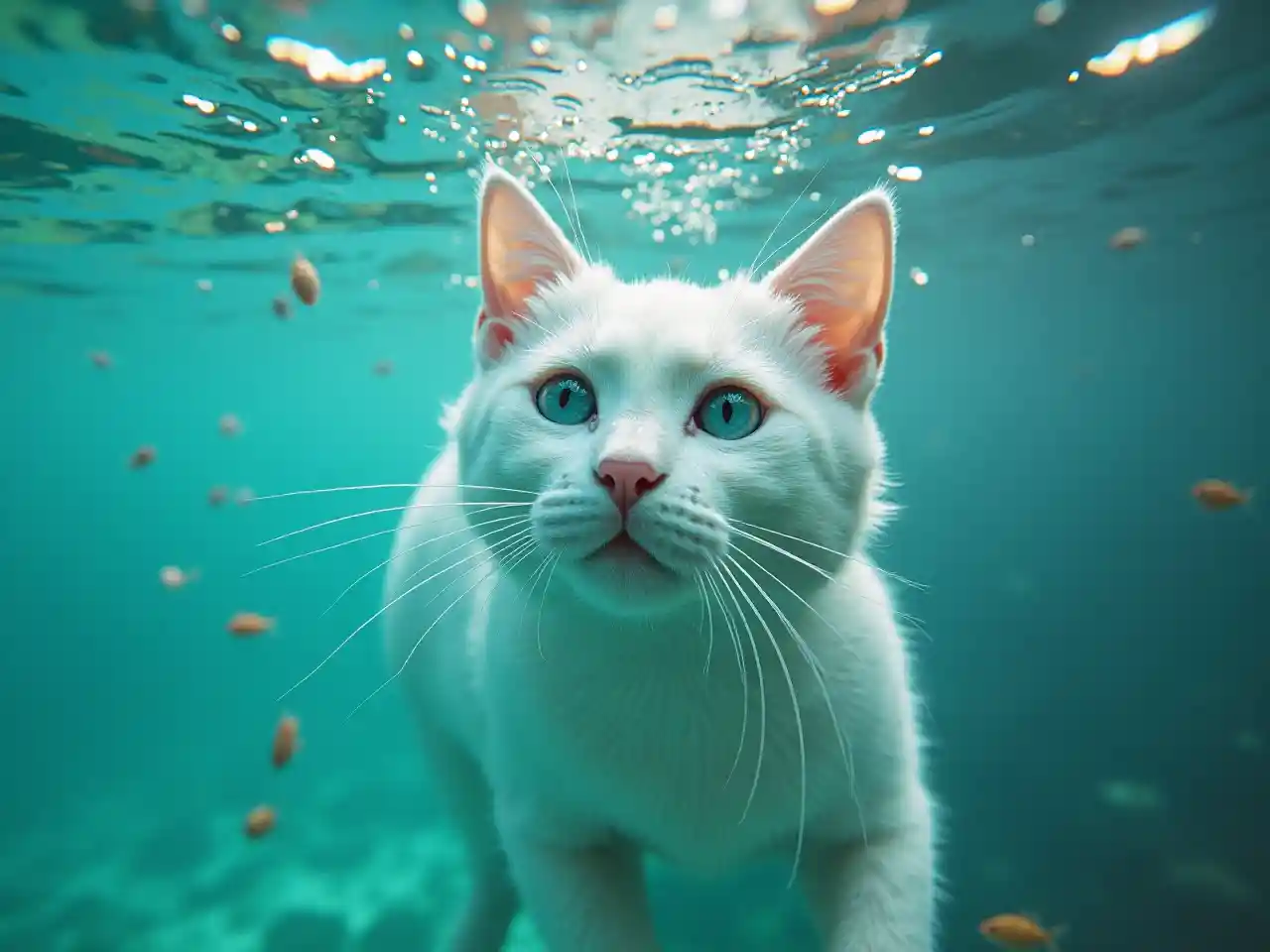 Ein Originalfoto aus den 2000er Jahren, eine majestätische weiße Katze, deren Fell glitzert wie Seebläschen, wenn sie elegant unter der Wasseroberfläche schwimmt. Die Augen der Katze, wie zwei funkelnde Opale, starren nach oben. Ein feiner Schwarm Fische fliegt an seinem Bart vorbei. Das umgebende Wasser ist ein faszinierender Strudel aus Türkis und Aquamarin mit dezenten Wellen und Andeutungen von Korallenrosa. Die Gesamtszene ist lebendig und dynamisch.