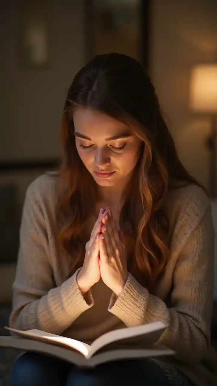 Die Frau nickt dankbar, die Hände beten, das Tagebuch leuchtet leicht.