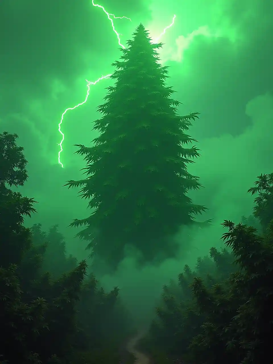 Riesige einzelne Hanfpflanzen werden wie Eichen von leuchtend grünen Blitzen getroffen, dicker grüner Nebel und grüner Rauch überall, verwilderte Wälder, alle Blätter sind leuchtend orange, überall wächst Marihuana, orangefarbenes Sonnenlicht schnüffelt durch die Wolken, grüne Blitze durchqueren die Wolken, hohe Detailgenauigkeit, klare Fokussierung, dramatisches Licht, Schärfentiefe, unglaublich hohe Details