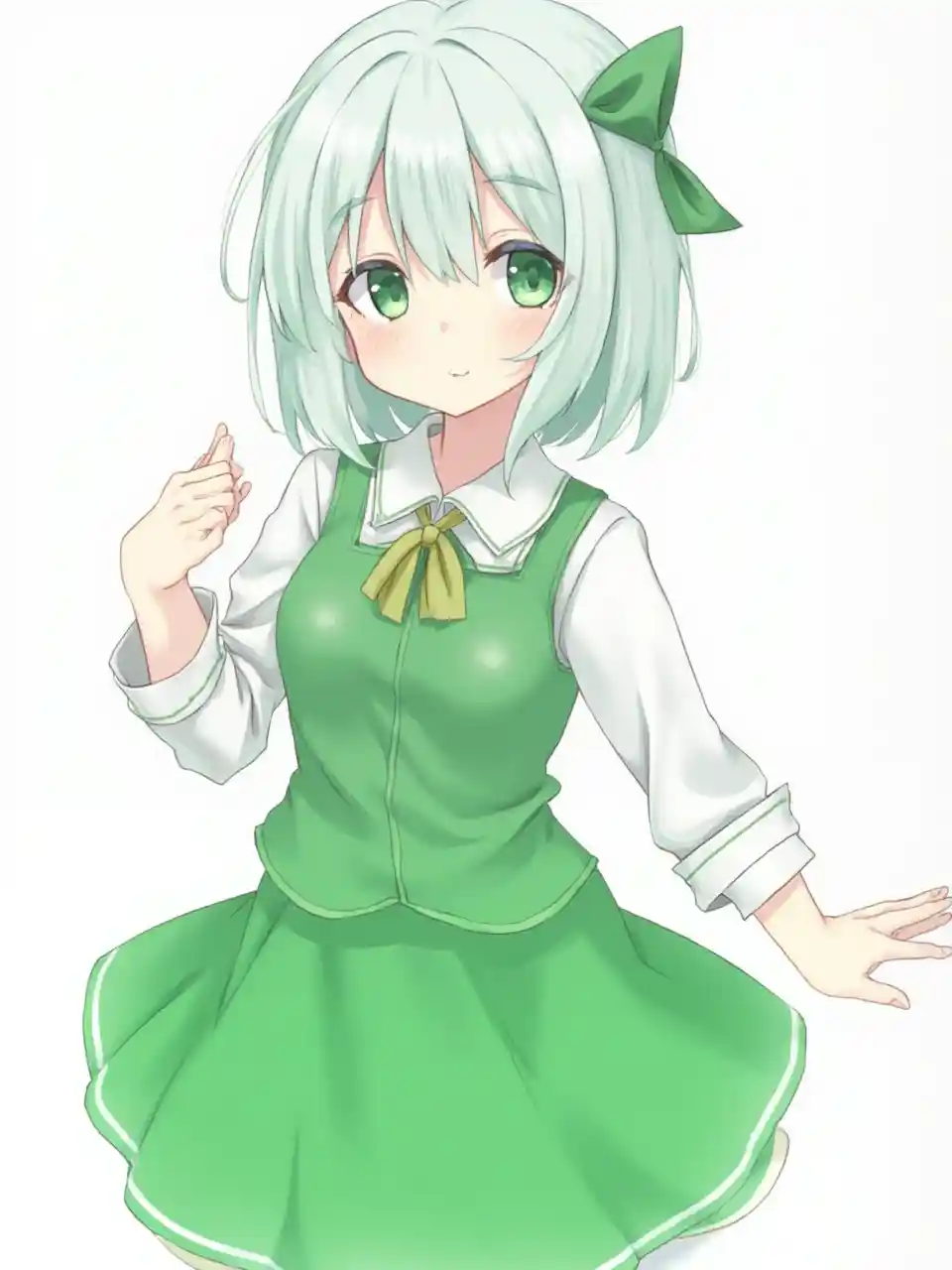 ZoeGrün-weiße Haare. Anime-Mädchen. Grün-weiße Kleider. Minirock. Grüne Augen. Grünes Band tragen. Tragen Sie weiße Stöcke.