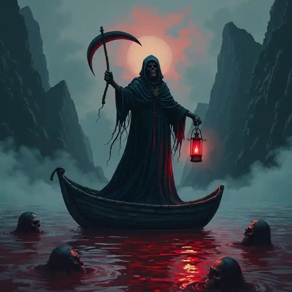 "Illustrierter Tod steht auf einem düsteren Boot auf dem blutroten Meer, umgeben von wirbelhaftem Nebel. In der einen Hand hält er eine Sense, in der anderen eine Laterne, die in schwachem Rot leuchtet. Dunkle, unebene Berge sind weit und teils in Nebel gehüllt. Im Wasser darunter erscheinen Schatten von verlorenen Seelen, deren Gesichter vom Licht der Laternen schwach erleuchtet werden. "