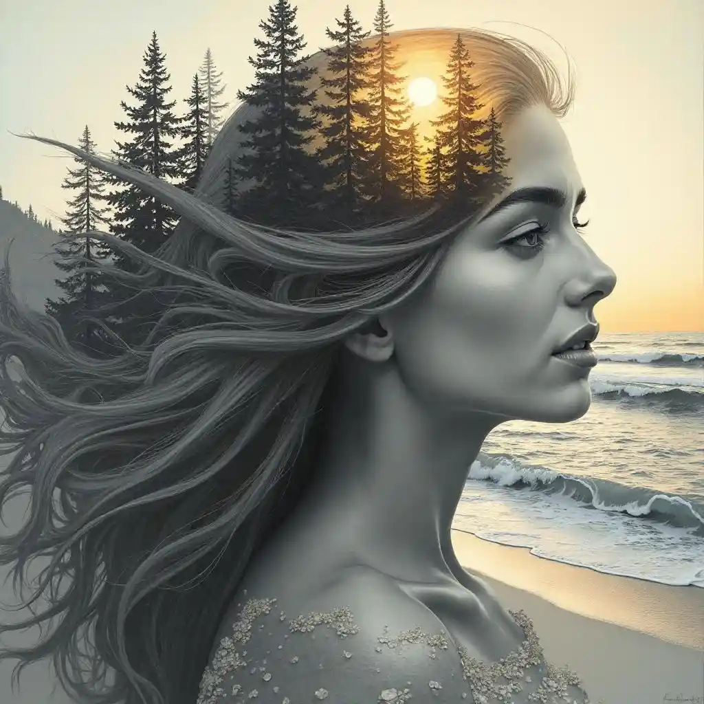 Ein faszinierendes Frauenbild, dessen Haare sich nahtlos in die atemberaubende Landschaft einfügen. Ihre Haare, wie weicher Sand und raue Wellen am Strand, sind mit hohen Tannensilhouetten am Horizont übersät. Die Sonne wirft warme Goldtöne, reflektiert die Wasseroberfläche und erhellt die Szene. Das Gesicht der Frau, kompliziert in Grautöne dargestellt, zeigt ihre Gesichtszüge sehr akribisch. Die monochromen Farben Schwarz, Weiß und Grau kontrastieren mit den lebendigen Farben der Landschaft und erzeugen eine auffällige und zum Nachdenken anregende Optik. Die Verschmelzung von Realismus und Abstraktion, begleitet vom Spiel von Licht und Schatten, verleiht dem Kunstwerk Tiefe und Emotion.