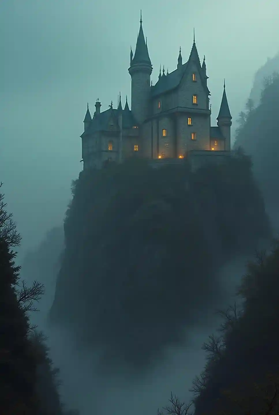 Dunstiges Klippenschloss mit glühenden Fenstern