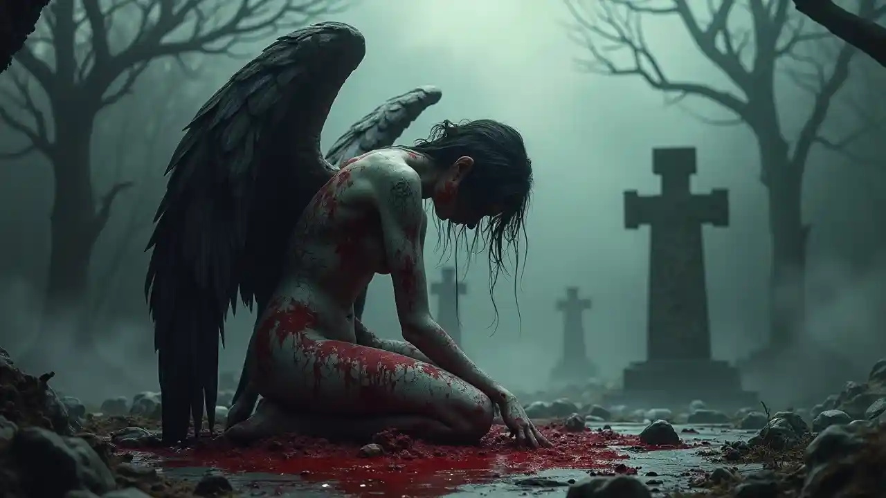 Ein eindringliches, erschreckendes Horror-Themenbild, ein verbeugender Engel, der mit seltsamen Blutspuren befleckt ist, wenn er in stiller Trauer kniet. Seine riesigen, zerfetzten Flügel hängen herab, sein Gefieder wird verdunkelt und zerrissen, als würde es einen uralten Fluch tragen. Mystische Symbole sind in die steinartige Haut gerissener Engel eingraviert, die in schummrigem, geisterhaftem Licht leuchten. Dichter Nebel schwebt über der Szene, und im Hintergrund tauchen düstere Schatten auf – verzerrte Statuen, raue Bäume und in der Ferne lauernde Gestalten. Die dunkelrote Farbe des Blutes kontrastiert mit der blassen Form des Engels und erzeugt eine erschreckende übernatürliche Wirkung. Die Palette wird von dunklen Farbtönen in Schwarz, Grau und Dunkelrot dominiert und verstärkt die unruhige und geheimnisvolle Atmosphäre. Das Gesamtbild ruft ein Gefühl der Tragödie hervor, der Angst.