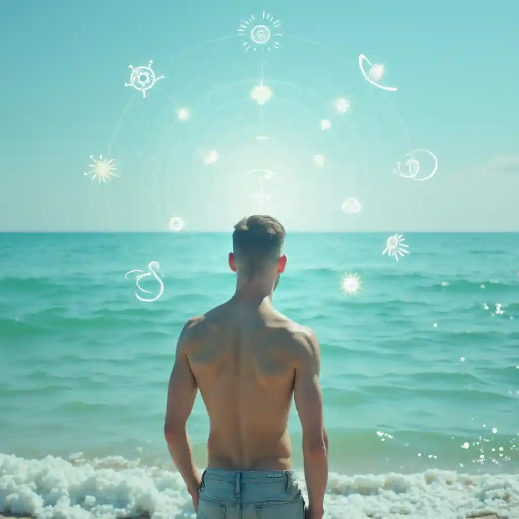 Erstellen Sie eine ruhige und faszinierende Buchhaut, die einen Mann darstellt, der am Meer steht und zum Horizont blickt. Das Meer soll in beruhigenden türkis-blau-weißen Tönen eine ruhige und ruhige Atmosphäre widerspiegeln. Leichte, dezente Wellen sollten sanft am Ufer flattern. Um den Kopf dieses haarlosen Mannes herum sind zahlreiche Symbole integriert, die die Häufigkeit der Heilung darstellen und auf sanfte, ätherische Weise ein sanftes Licht ausstrahlen. Frequenzen sollen eine Art beruhigende Aura schaffen, die Gelassenheit und Wohlbefinden hervorruft. Das Gesamtdesign verwendet hellere Farben, die ein ruhiges, nach oben gerichtetes Gefühl bewahren. Für den Titel des Buches sind klare große Schriftzüge enthalten, die darauf achten, dass sie gut lesbar sind. Außerdem wurde dem Design "by Ricardo Arellano" hinzugefügt.