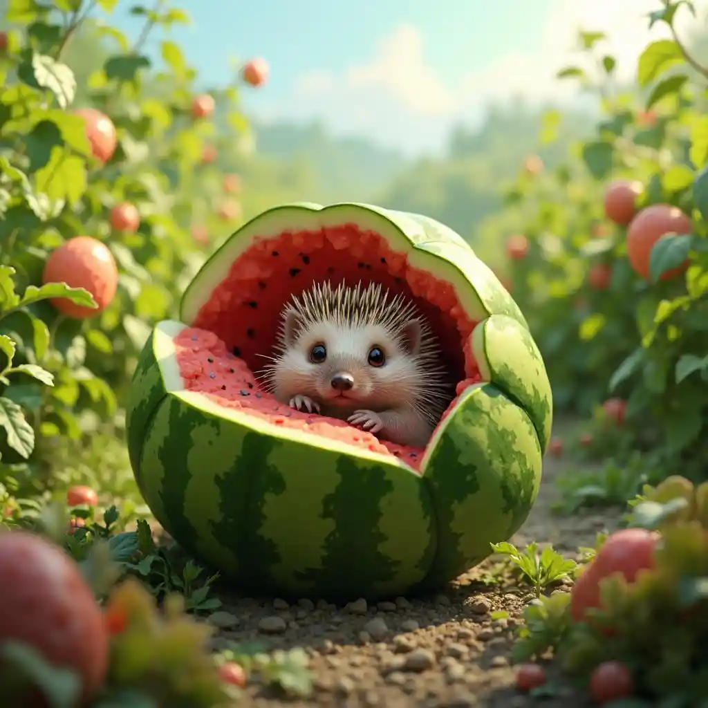 Erstellen Sie das realistische Bild eines Igels, der in eine Wassermelone eindringt und fröhlich saftige Früchte von innen isst. Der Igel befindet sich teilweise im Inneren der Wassermelone, das süße Gesicht und die Stacheln sind gut zu erkennen. Im Hintergrund ist ein üppiges Wassermelonenfeld dargestellt, das lebendige grüne Reben und reife Wassermelonen unter dem sonnigen Himmel zeigt. Die Szene soll eine Art Laune und Naturfreude vermitteln.