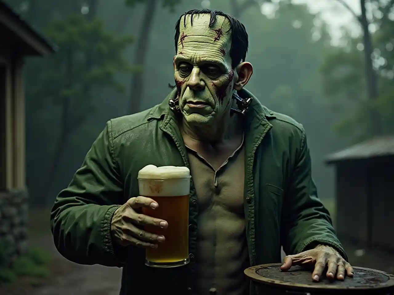 Hermann Münster als Frankensteins Monster, grüne Haut, Pastellpalette, stimmungsvolle, gruselige, verwickelte Details, auferstandene Leichen, Narbengewebe, Verwesung, Hauptaugen, Horror, Grusel, abgestreckte Bolzen auf beiden Seiten des Nackens, Gangrän, Venen, Unvollständigkeit, Stiche in der Stirn, steht neben dem Grill im Freien und hält einen Bierkrug in einer Hand