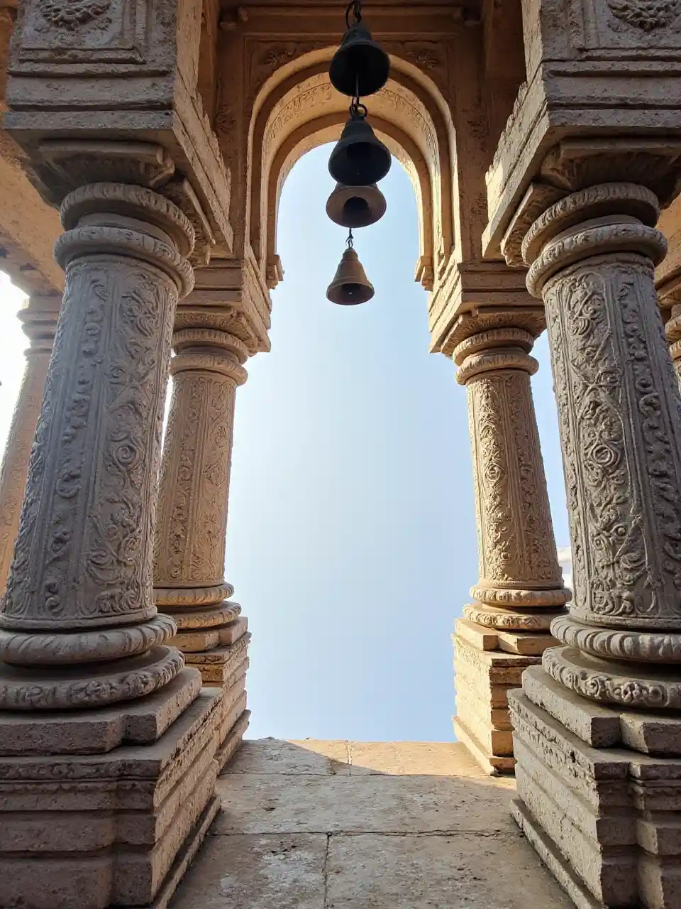 WyattSymmetrischer Blick auf hinduistische Tempelpfeiler mit Bogen- und hängenden Glocken