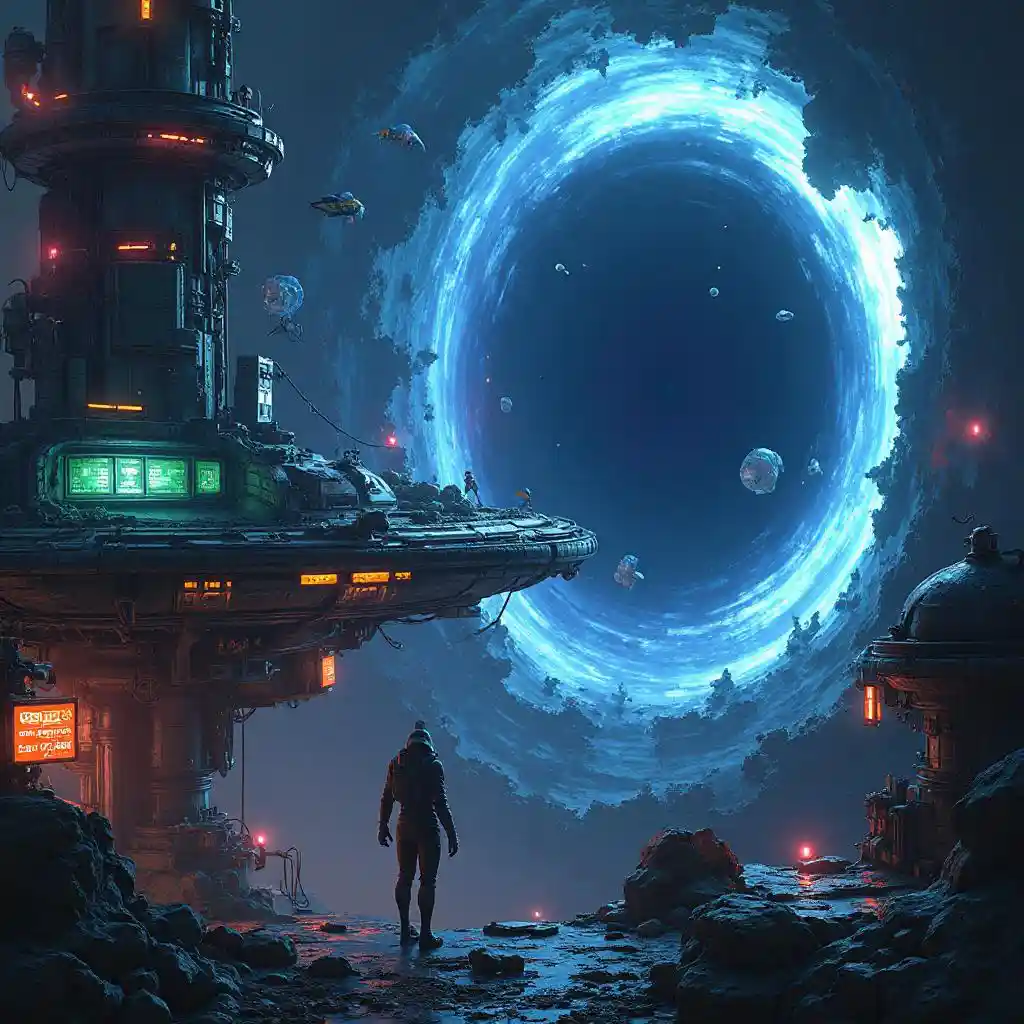 In einer Szene voller Science-Fiction-Farben schwebt eine riesige Raumstation am Rand eines rotierenden Schwarzen Lochs, und ihre Akkretionsscheibe leuchtet in Blau- und Violetönen und wirft Schatten auf ihre bröckelnde Metallstruktur aus dem 32. Jahrhundert. Die Station hat einen kreisförmigen Bau- und Glasturm mit Gärten mit fremden Pflanzen, die grün und gelb leuchten. Der Gravitationsschaden dieses Lochs ist an den freigelegten Drähten und dem zerbrochenen Bildschirm des blinkenden roten Alarms offensichtlich, während kleine insektenähnliche Raumschiffe versuchen zu entkommen, einige werden in die Dunkelheit gezerrt. Sein Kern ist der Protagonist: eine Person in einem intelligenten Raumanzug und einem blauen Energieschild, die Flanke ist ein Spinnenroboter, der an der Verkabelung tüftelt, und ein silberner Außerirdischer mit Kristallaugen und Armen, die sich in Werkzeuge verwandeln können. Die Gefahr geht aus dem transparenten energiebiologischen Manipulationssystem der Raumstation hervor. Der holografische holografische Bildschirm zeichnet eine Karte des Schwarzen Lochs, und die Laserwaffe sendet einen roten Lichtstrahl aus, um die Kreatur abzuwehren. Im Kontrollraum strahlt ein rotierender Quantenkern, der einer Kristallkugel ähnelt, elektrische Funken aus. Die Atmosphäre ist eine Mischung aus Dunkelheit und Scheibenleuchten, Metallquallen bewegen sich stromabwärts in der Schwerelosigkeit, mysteriöse Graffiti an den Wänden und ein Tropfen klebriges außerirdisches Blut schwebt nach dem Kampf. Versteckte Geschichten? Ein geheimes Experiment zur Gewinnung der Energie von Schwarzen Löchern hat die "Beschützer von Schwarzen Löchern" freigelassen, die die Gesetze der Physik vor menschlicher Manipulation schützen!