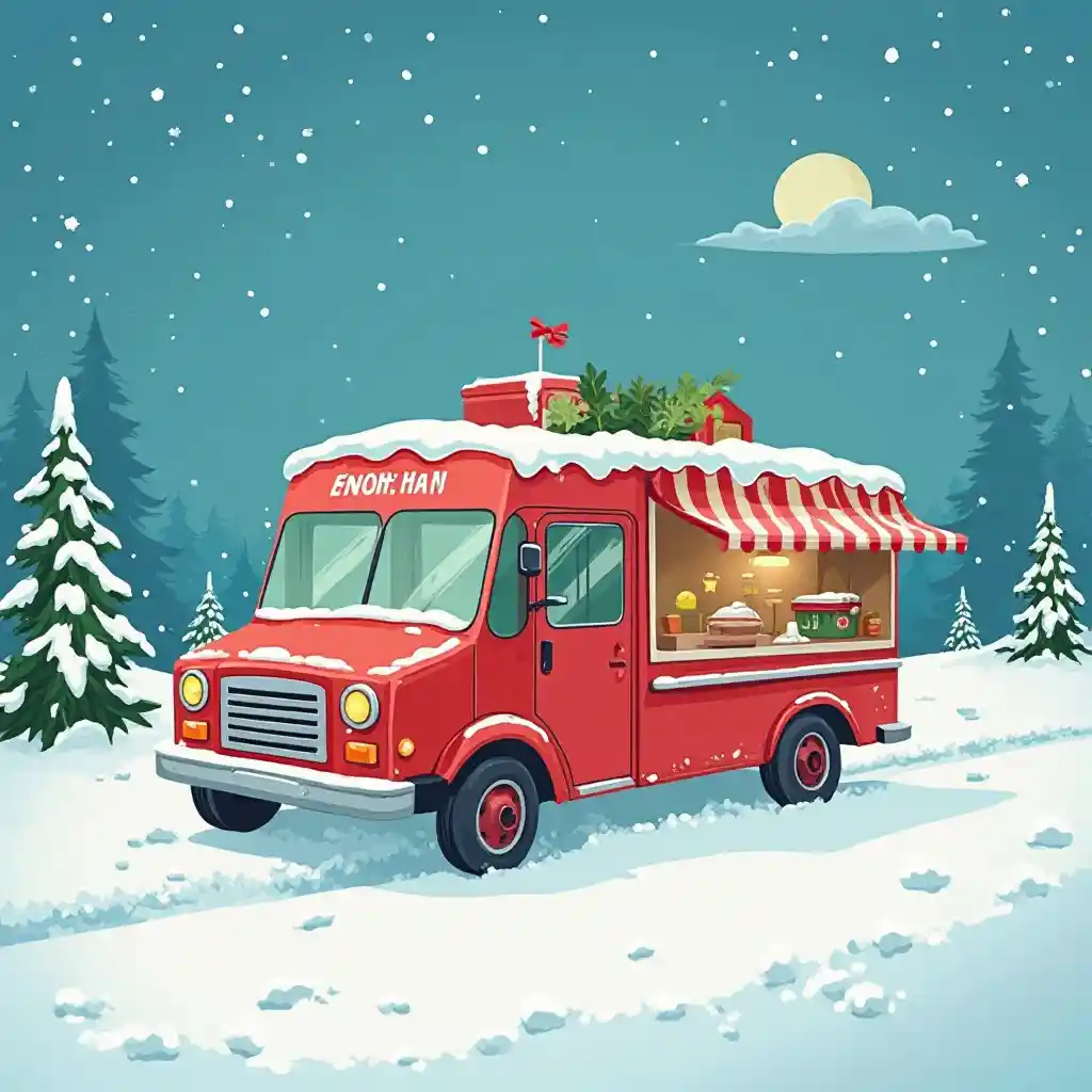 Ein Foodtruck im Weihnachtskarten-Illustrationsstil pflügt auf Schnee