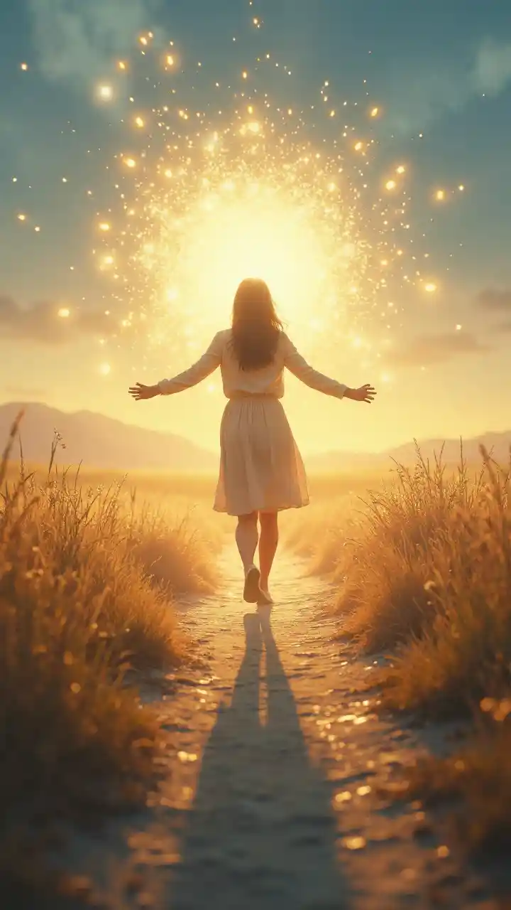 Die Protagonistin auf dem Weg zum Horizont. Zeitlupe mit offenen Armen drehen sich, Licht strömt aus ihrem Herzen. Dann kritzelte ein Stift "Ende" und blätterte diese Seite auf ein weißes Blatt mit der Aufschrift: "Kapitel zwei: Mehr Wunder.
