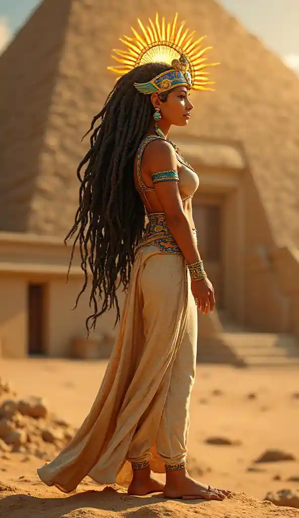 AidenÄgyptischer Sonnengott Horus, Schöne Jungfrau, Engel, Ganzkörperporträt, detaillierte goldene Beschreibung, Wüstensand, altägyptischer Tempel, farbenfrohe Dekoration